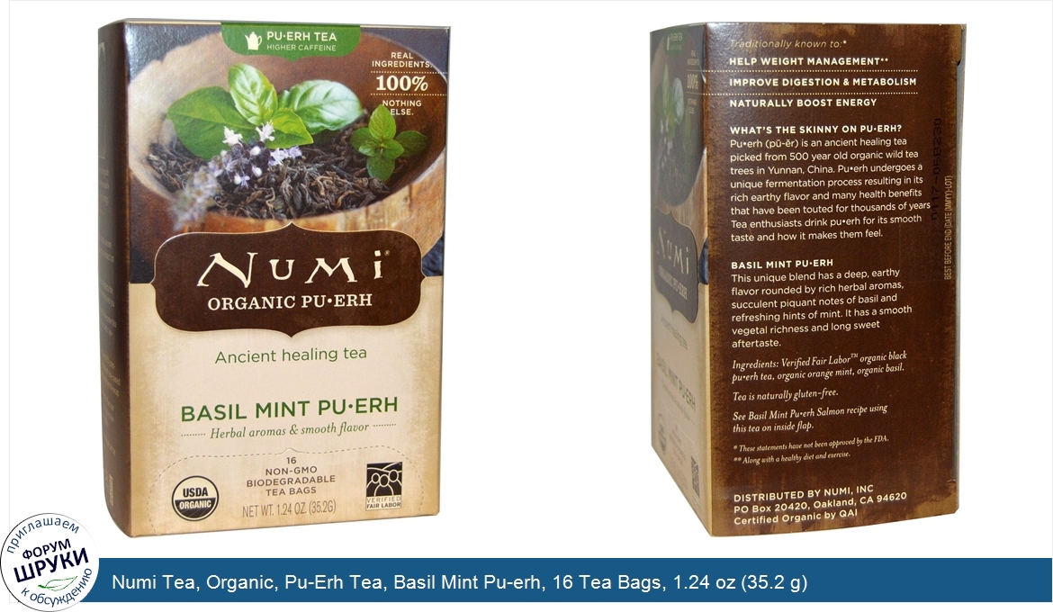 Numi Tea, Organic, Pu-Erh Tea, Basil Mint Pu-erh, 16 Tea Bags, 1.24 oz (35.2 g)