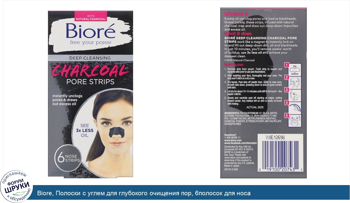 ru Biore, Полоски с углем для глубокого очищения пор, 6полосок для носа