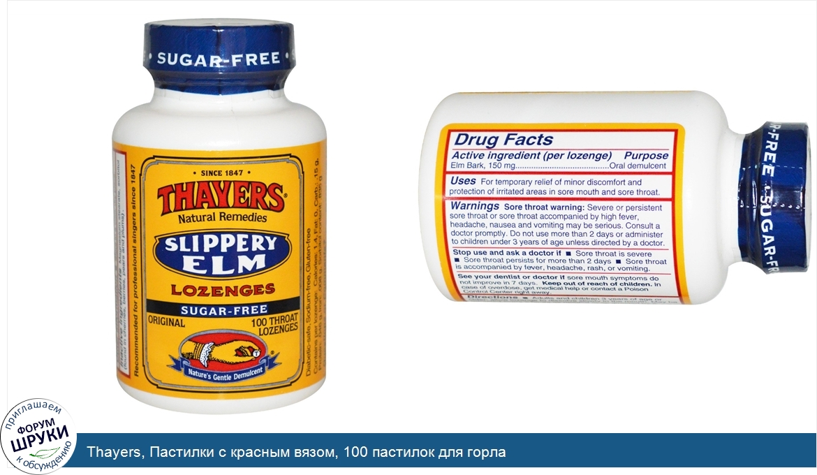 Друзья, если у вас есть отзыв/дополнение/комментарий/вопрос относительно Thayers, Пастилки с красным вязом, 100 пастилок для горла - напишите его ответом в эту тему (это будет полезно всему сообществу в целом и вам в отдельности).
