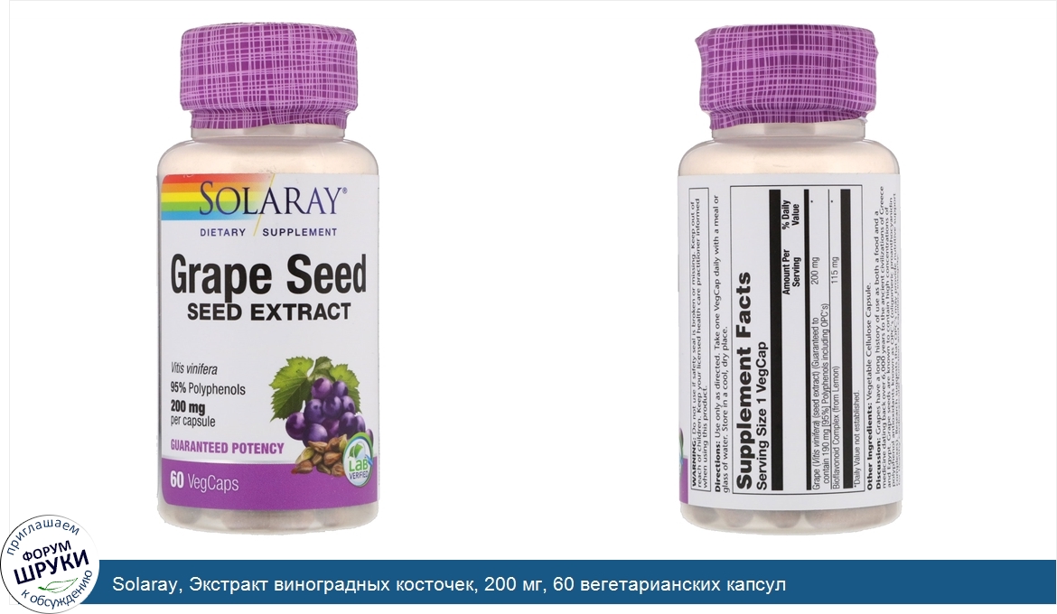 Solaray, Экстракт виноградных косточек, 200 мг, 60 вегетарианских капсул