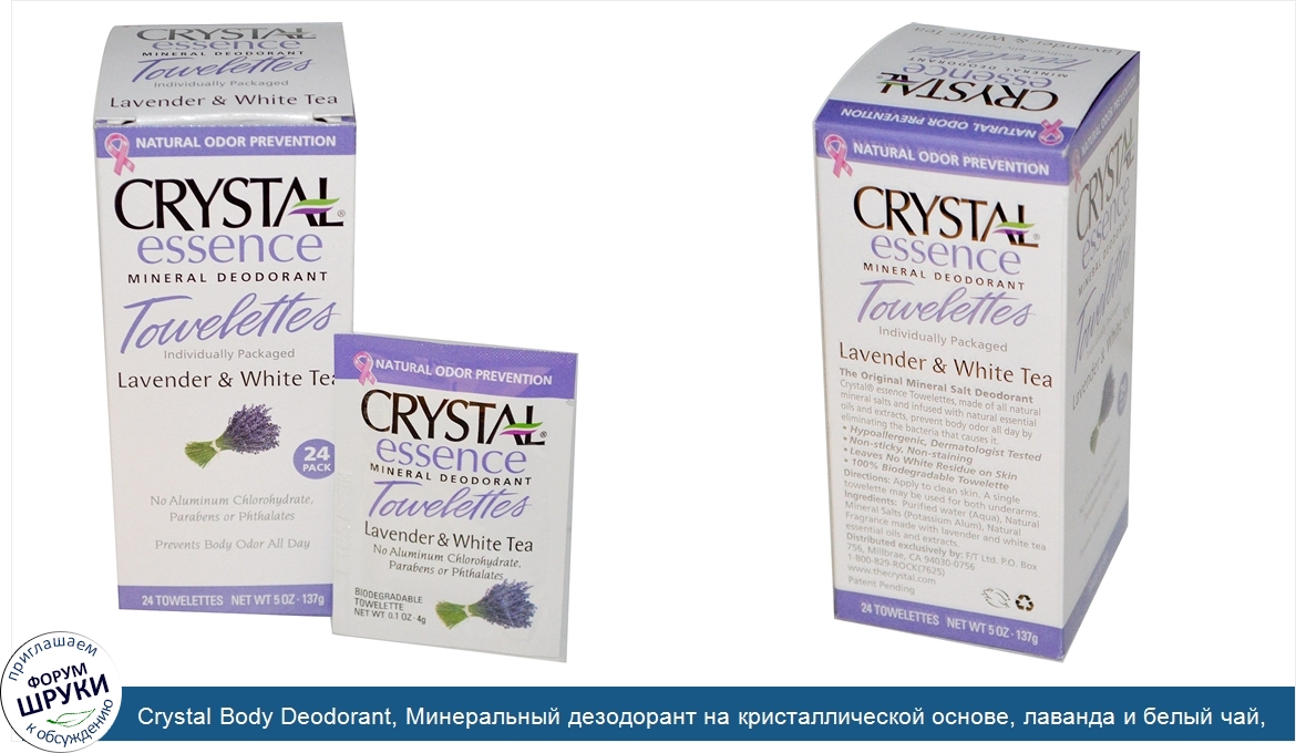 Crystal Body Deodorant, Минеральный дезодорант на кристаллической основе, лаванда и белый чай, 24 влажных салфеток
