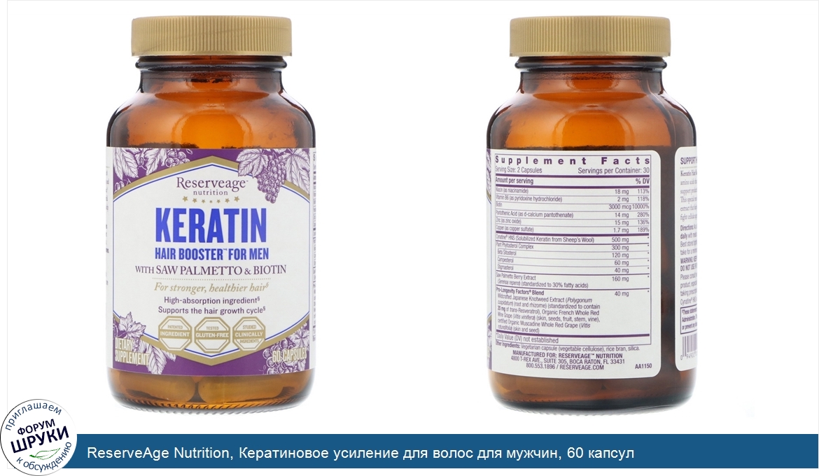 [DESCRIPT]Пищевая добавка. С пальмой сереноа и биотином. Для более крепких и здоровых волос. Легко усваиваемые ингредиенты. Поддержка всего цикла роста волос. Ингредиент защищен патентом. Отсутствие глютена подтверждено тестами. Клинически исследованные ингредиенты. Формула для мужчин. Cynatine HNS Keratin: с помощью запатентованного процесса мы создаем мощный, готовый к усвоению кератин с уникальной биодоступностью, содержащий 18 аминокислот, включая цистеин. Биотин: Незаменимый витамин, важный для здоровья тканей организма, включая волосы, кожу и ногти. Комбинация факторов долголетия: наша собственная смесь антиоксидантов с транс-ресвератролом для защиты клеток. Транс-ресвератрол: активный и стабильный полифенол из дикорастущей рейнутрии японской, содержащей транс-ресвератрол в большей концентрации, чем в красном вине. Пальма сереноа: экстракт ягод, богатый жирными кислотами и фитостеролами. Это растение традиционно использовалось для поддержания здоровой функции простаты и мужской силы. Для пышной шевелюры. Reserveage Nutrition предлагает подкрепленные научными исследованиями решения для поддержки строительных элементов здорового роста волос. Keratin Hair Booster for Men содержит 18 аминокислот, помогающих усилить прочность волос с возрастом, а также поддерживает выработку кератина - структурного белка волос. Наша уникальная формула содержит Cynatine HNS - запатентованный и клинически исследованный кератин, отличающийся высокой растворяемостью для оптимальной пользы. Исследования показывают, что он может уменьшить выпадение волос и поддержать цикл роста волос. С добавлением биотина для поддержки естественной выработки кератина. Эта проактивная формула также содержит пальму сереноа - растительный экстракт, потенциально способный поддержать здоровую мужскую силу. Кроме того, наша собственная смесь факторов долголетия с ресвератролом обеспечит вас антиоксидантами для борьбы со старением. Наша цель. Вдохновленные мудростью природы и самыми здоровыми культурами мира, мы путешествуем по земному шару в поисках лучших ингредиентов. Наша цель заключается в том, чтобы обеспечить, где это возможно, органическими и натуральными ингредиентами важнейшие и научно обоснованные продукты, которые обладают преимуществами и способны изменить вашу жизнь. Наша миссия лежит в предложении продуктов, которые питают ваше тело, защищают нашу планету и сохраняют традиционные культуры.[/DESCRIPT]... (описание дополняется)