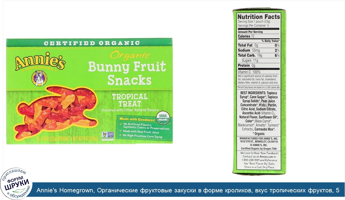 Друзья, если у вас есть отзыв/дополнение/комментарий/вопрос относительно Annie's Homegrown, Органические фруктовые закуски в форме кроликов, вкус тропических фруктов, 5 упаковок, 0.8 унций (23 г) шт. - напишите его ответом в эту тему (это будет полезно всему сообществу в целом и вам в отдельности).