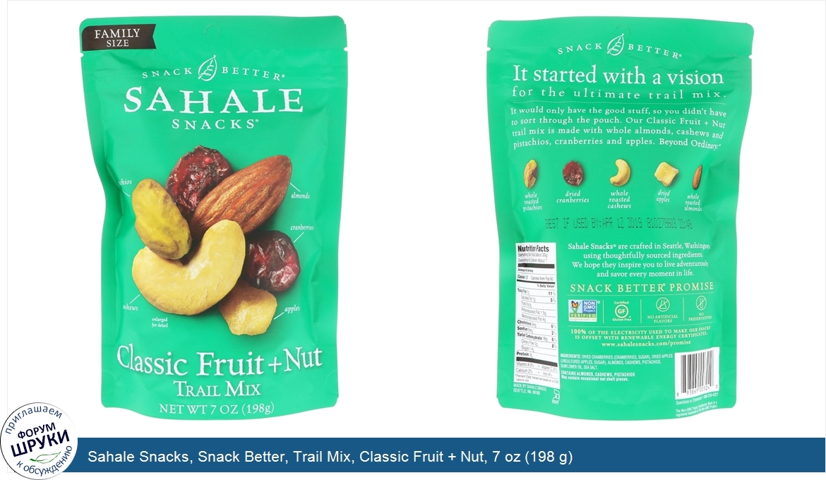 [DESCRIPT]Family Size. Snack Better. Pistachios. Almonds. Cranberries. Cashews. Apples. K-Parve. It started with a vision for the ultimate trail mix. It would only have the good stuff, so you didn't have to sort through the pouch. Our Classic Fruit + Nut trail mix is made with whole almonds, cashews and pistachios, cranberries and apples. Beyond ordinary. Whole roasted pistachios. Dried cranberries. Whole roasted cashews. Dried apples. Whole roasted almonds. Sahale Snacks are crafted in Seattle, Washington using thoughtfully sourced ingredients. We hope they inspire you to live adventurously and savor every moment in life. Snack Better Promise. Non GMO Project Verified. Certified Gluten-Free. No Artificial Flavor. No Preservatives.[/DESCRIPT]... (описание дополняется)