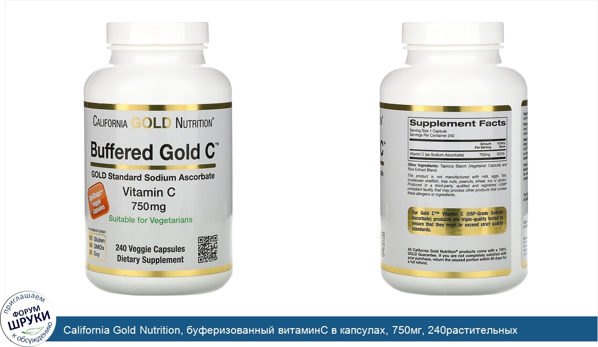 . California Gold Nutrition. ®,. Buffered Gold C, некислый буферизованный витамин C. Содержит аскорбат натрия, соответствующий золотому стандарту USP. Растительные капсулы TapiOgels™ для сохранения качества и эфф...