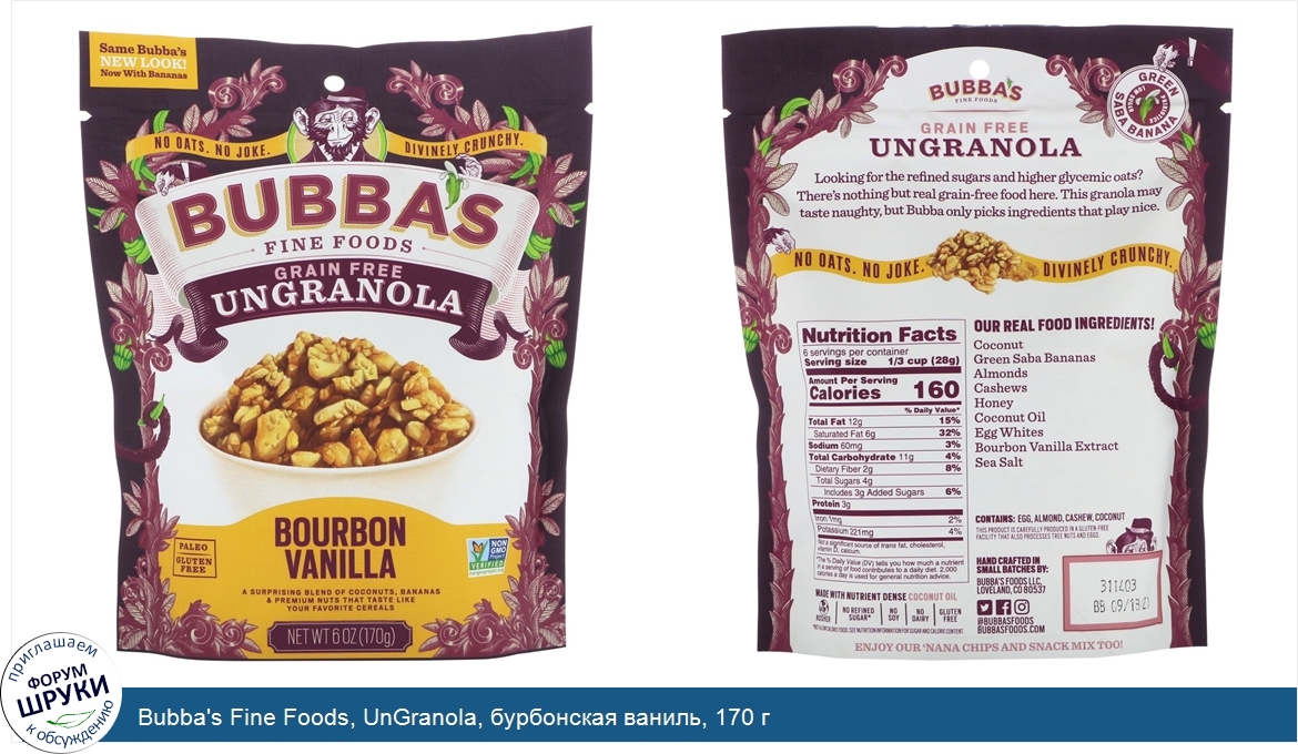 Друзья, если у вас есть отзыв/дополнение/комментарий/вопрос относительно Bubba's Fine Foods, UnGranola, бурбонская ваниль, 170 г - напишите его ответом в эту тему (это будет полезно всему сообществу в целом и вам в отдельности).