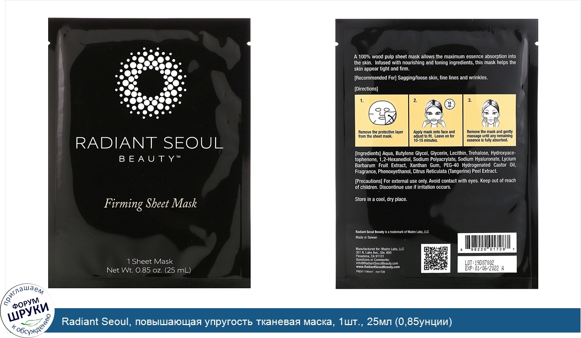 . Повышающая упругость тканевая маска. Radiant Seoul Beauty. ™. Гиалуроновая кислота, лецитин и экстракты фруктов. Рекомендуется для борьбы с мелкими и глубокими морщинами, а также при дряблости кожи. Питание и т...