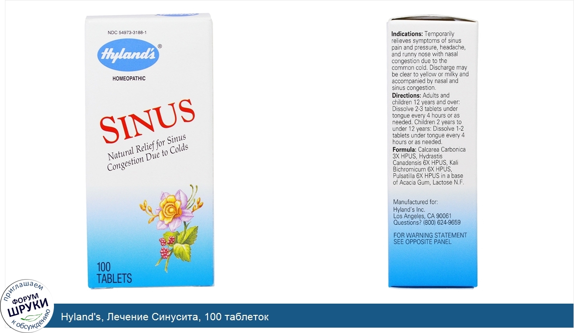 [DESCRIPT]Homeopathic. Natural Relief for Sinus Congestion Due to Colds. Formerly Hyland's #47, Hyland's Sinus is a traditional homeopathic formula for the relief of symptoms of runny nose with clear to yellow or milky discharge, and nasal and sinus congestion due to the common cold. Hyland's Sinus stimulates your body's natural healing response to relieve symptoms and is safe for adults and children. Indications: Temporarily relieves symptoms of sinus pain and pressure, headache, and runny nose with nasal congestion due to the common cold. Discharge may be clear to yellow or milky and accompanied by nasal and sinus congestion.[/DESCRIPT]... (описание дополняется)