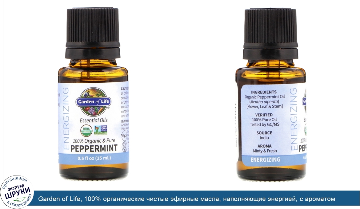 Garden of Life, 100% органические чистые эфирные масла, наполняющие энергией, с ароматом перечной мяты, 15мл (0,5 жидк.унции)