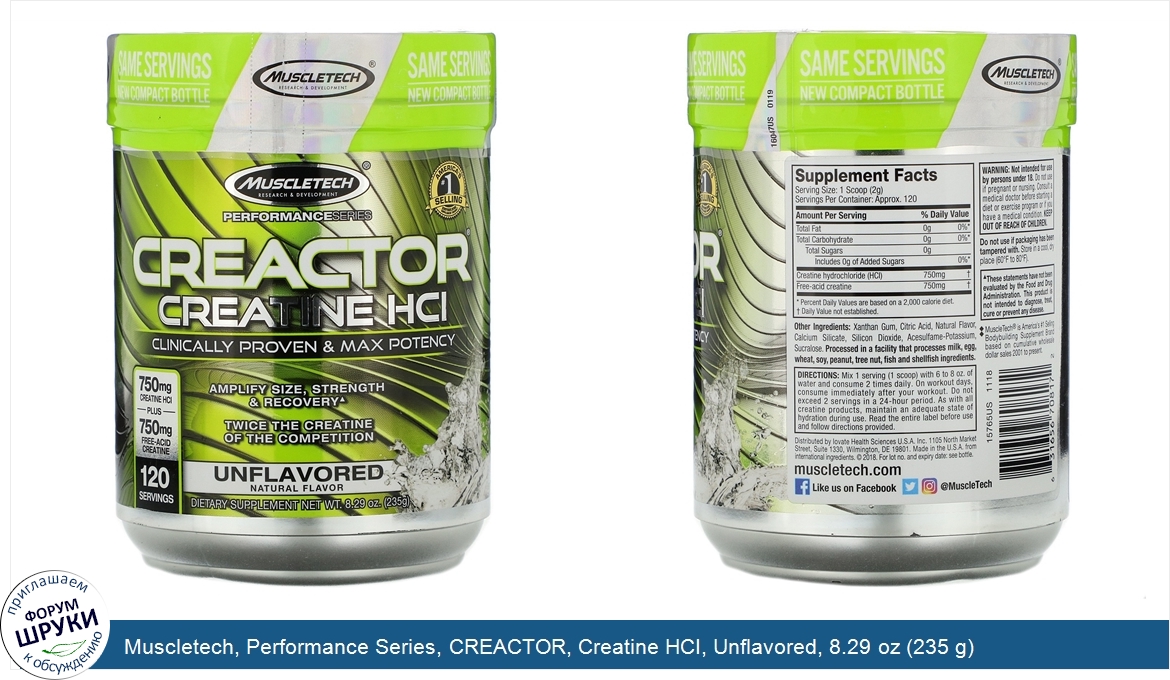Друзья, если у вас есть отзыв/дополнение/комментарий/вопрос относительно Muscletech, Performance Series, CREACTOR, Creatine HCI, Unflavored, 8.29 oz (235 g) - напишите его ответом в эту тему (это будет полезно всему сообществу в целом и вам в отдельности).
