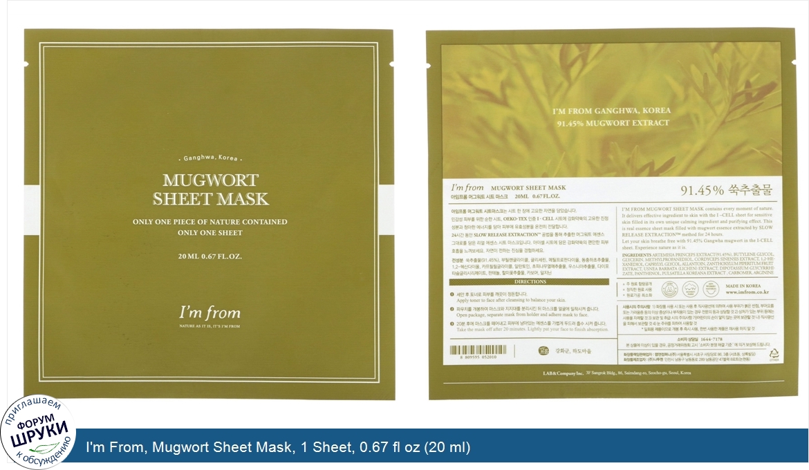 Друзья, если у вас есть отзыв/дополнение/комментарий/вопрос относительно I'm From, Mugwort Sheet Mask, 1 Sheet, 0.67 fl oz (20 ml) - напишите его ответом в эту тему (это будет полезно всему сообществу в целом и вам в отдельности).