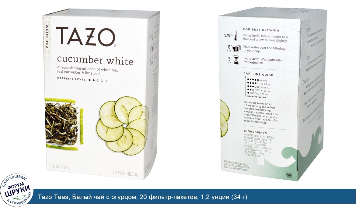 Друзья, если у вас есть отзыв/дополнение/комментарий/вопрос относительно Tazo Teas, Белый чай с огурцом, 20 фильтр-пакетов, 1,2 унции (34 г) - напишите его ответом в эту тему (это будет полезно всему сообществу в целом и вам в отдельности).