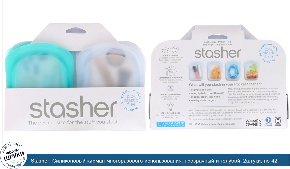 Друзья, если у вас есть отзыв/дополнение/комментарий/вопрос относительно Stasher, Силиконовый карман многоразового использования, прозрачный и голубой, 2штуки, по 42г (4унции) - напишите его ответом в эту тему (это будет полезно всему сообществу в целом и вам в отдельности).