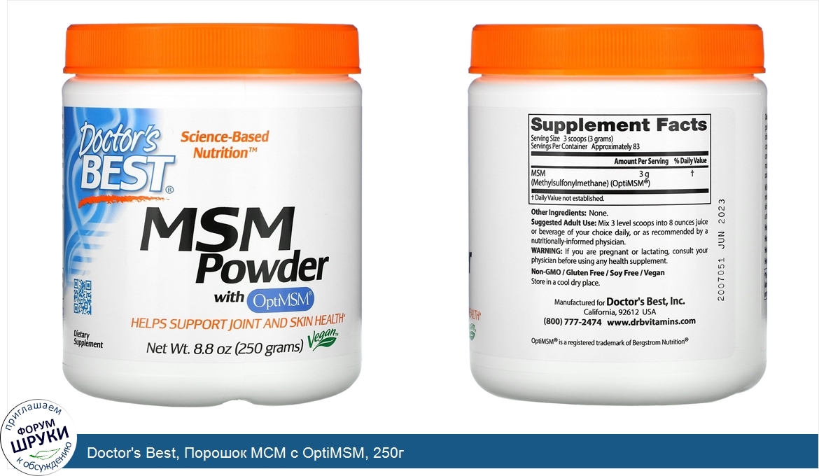 Друзья, если у вас есть отзыв/дополнение/комментарий/вопрос относительно Doctor's Best, Порошок МСМ с OptiMSM, 250г - напишите его ответом в эту тему (это будет полезно всему сообществу в целом и вам в отдельности).