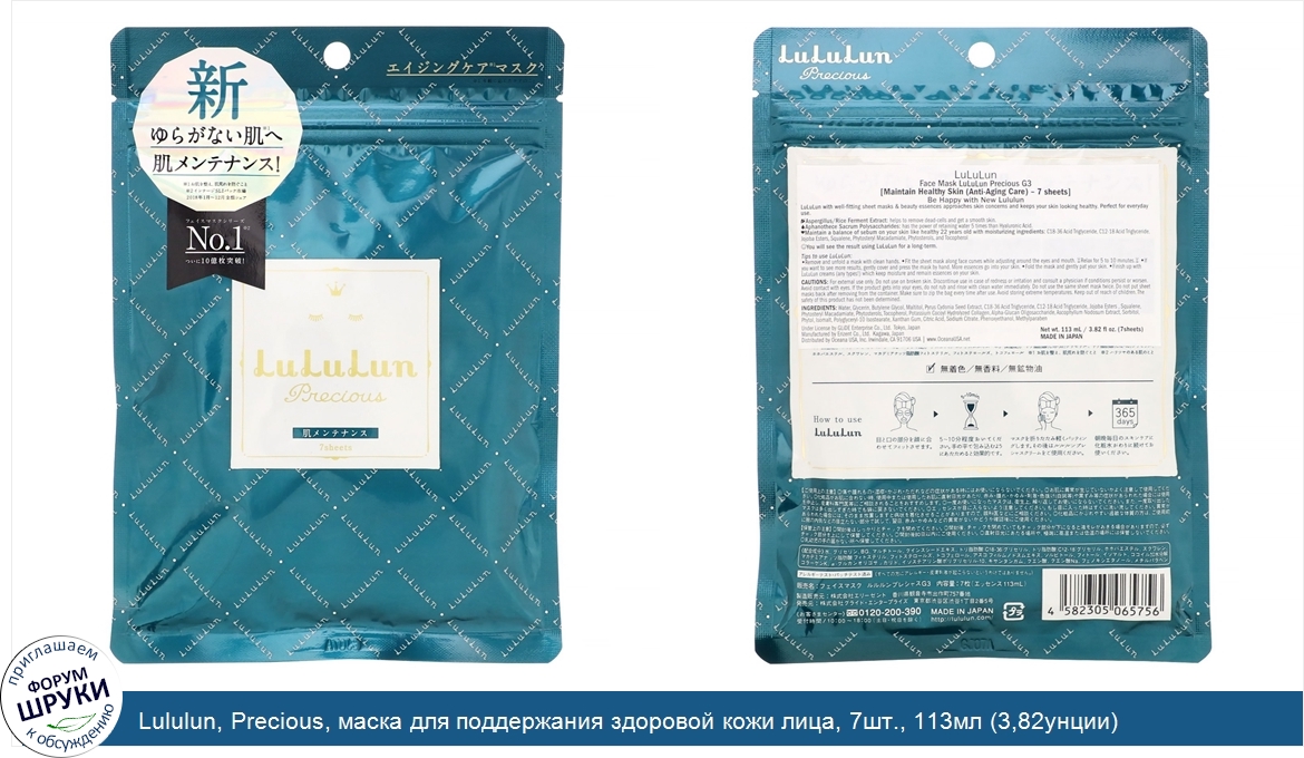 Друзья, если у вас есть отзыв/дополнение/комментарий/вопрос относительно Lululun, Precious, маска для поддержания здоровой кожи лица, 7шт., 113мл (3,82унции) - напишите его ответом в эту тему (это будет полезно всему сообществу в целом и вам в отдельности).
