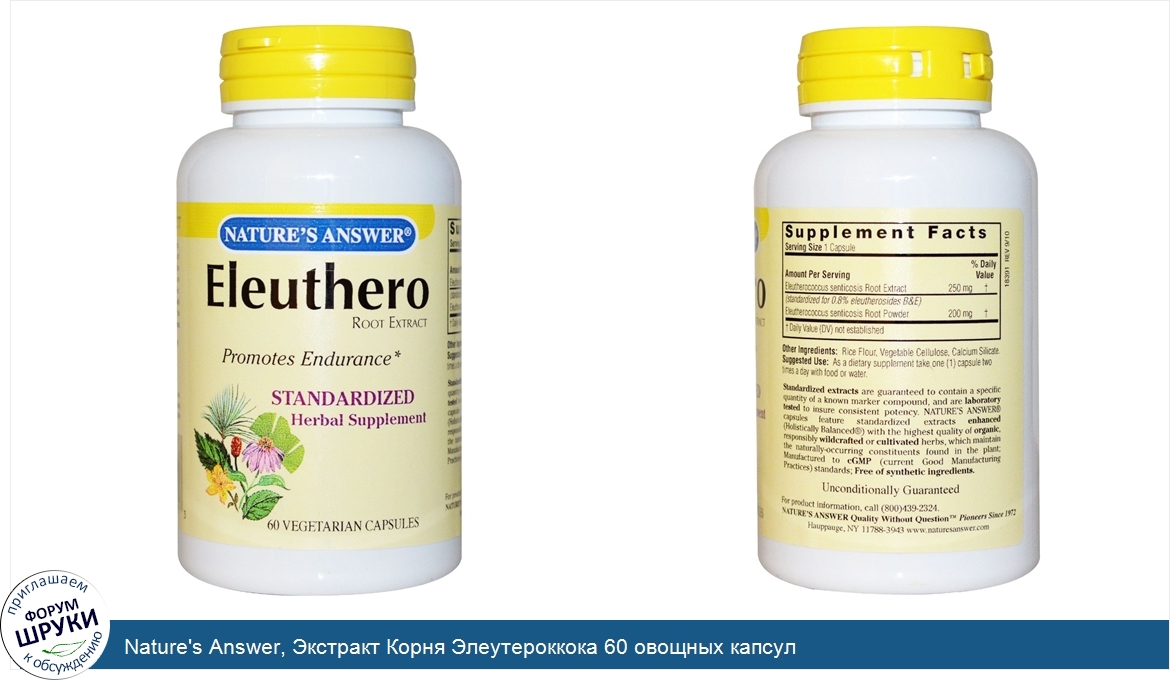 Друзья, если у вас есть отзыв/дополнение/комментарий/вопрос относительно Nature's Answer, Экстракт Корня Элеутероккока 60 овощных капсул - напишите его ответом в эту тему (это будет полезно всему сообществу в целом и вам в отдельности).