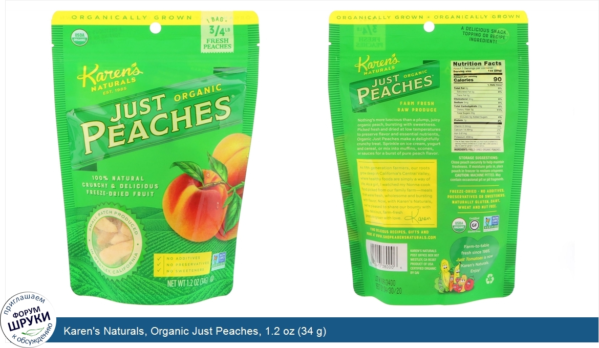[DESCRIPT]Organically Grown. 1 Bag = 3/4 lb Fresh Peaches. USDA Organic. Est. 1985. 100% Natural. Crunchy Delicious. Freeze-Dried Fruit. Small Batch Produced in Westley, California. No Additives. No Preservatives. No Sweeteners. Non-GMO Project Verified. Kosher. A Delicious Snack, Topping or Recipe Ingredient! . Farm Fresh. Raw Produced. Naturally Gluten, Dairy, Wheat and Nut Free. Certified Gluten-Free. Certified Organic by Q.A.I. Nothing’s more luscious than a plump, juicy organic peach, bursting with sweetness. Picked fresh and dried at low temperatures to preserve flavor and essential nutrients, Organic Just Peach makes a delightfully crunchy treat. Sprinkle on ice cream, yogurt and cereal, or mix into muffins, scones, or sauces for a burst of pure peach flavor. As fifth generation farmers, our roots grow deep in California’s Central Valley, where healthy foods are simply a way of life, As a girl, I watched my Nonna cook food picked from our family farm—meals that were fresh, wholesome and bursting with flavor. Now, with Karen’s Naturals, we’re pleased to share our bounty with you: delicious, farm-fresh produce grown with love. Farm-to-table fresh since 1985, Just Tomatoes is now Karen’s Naturals. Enjoy![/DESCRIPT]... (описание дополняется)