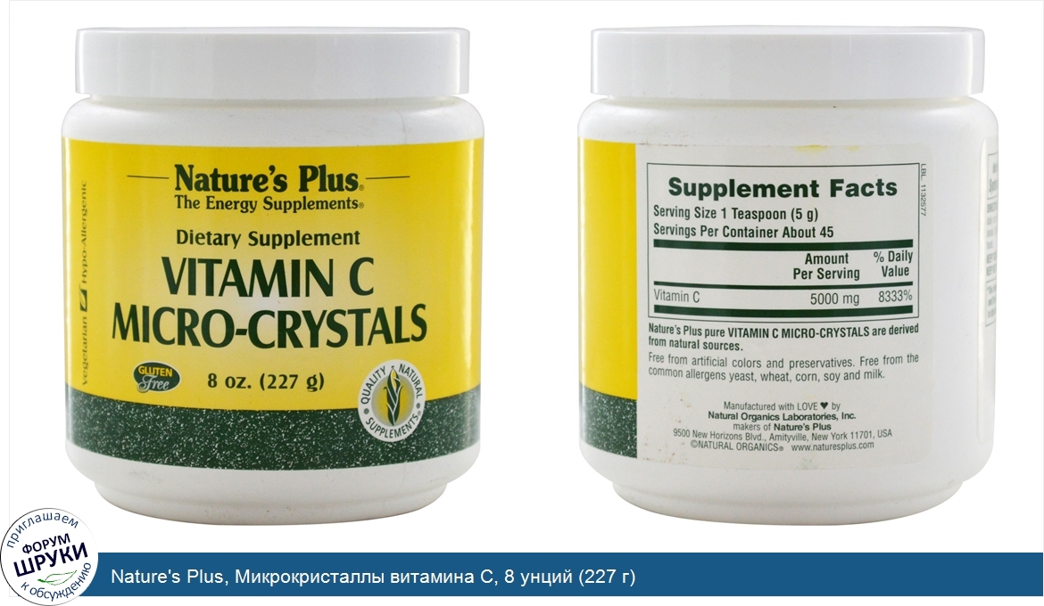 [DESCRIPT]The Energy Supplements. Dietary Supplement. Vegetarian. Hypo-Allergenic. Gluten Free. Quality Natural Supplements. Nutritional support for antioxidant systems and overall well-being. There's a reason why Vitamin C is the most well-known and highly regarded vitamin in the world: its antioxidant powers run broad and deep, impacting many of the body's internal systems extensively; including the immune system. Nature's Plus 100% pure Vitamin C Micro-Crystals are perfect to add to juice or sprinkle on food. Derived from natural sources, each heaping teaspoon contains approximately 5,000 mg (5g) of Vitamin C.[/DESCRIPT]... (описание дополняется)