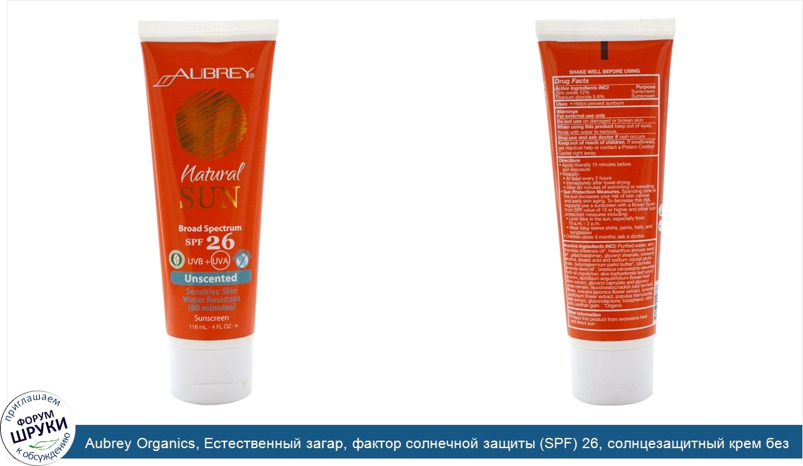 ru Aubrey Organics, Естественный загар, фактор солнечной защиты (SPF) 26, солнцезащитный крем без запаха, 4 жидких унции (118 мл)