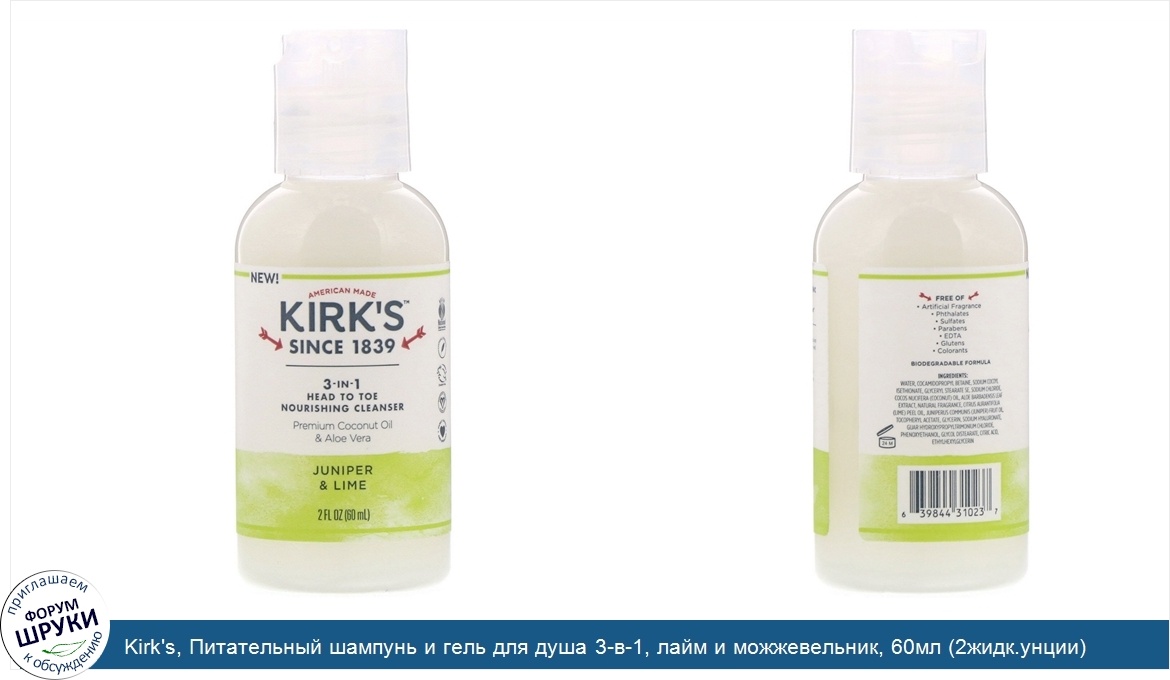 Друзья, если у вас есть отзыв/дополнение/комментарий/вопрос относительно Kirk's, Питательный шампунь и гель для душа 3-в-1, лайм и можжевельник, 60мл (2жидк.унции) - напишите его ответом в эту тему (это будет полезно всему сообществу в целом и вам в отдельности).