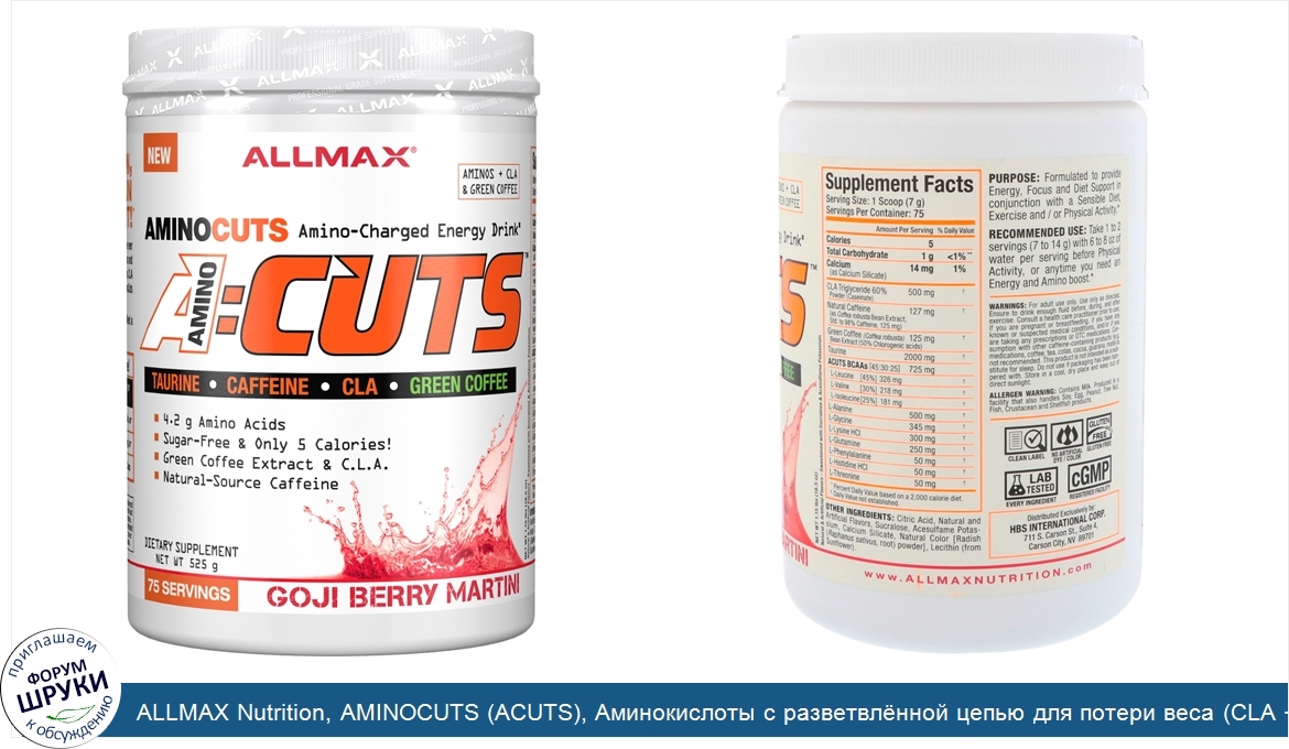 ALLMAX Nutrition, AMINOCUTS (ACUTS), Аминокислоты с разветвлённой цепью для потери веса (CLA + аминоэтансульфокислота + зеленый кофе), Ягоды Годжи Мартини, 525 г