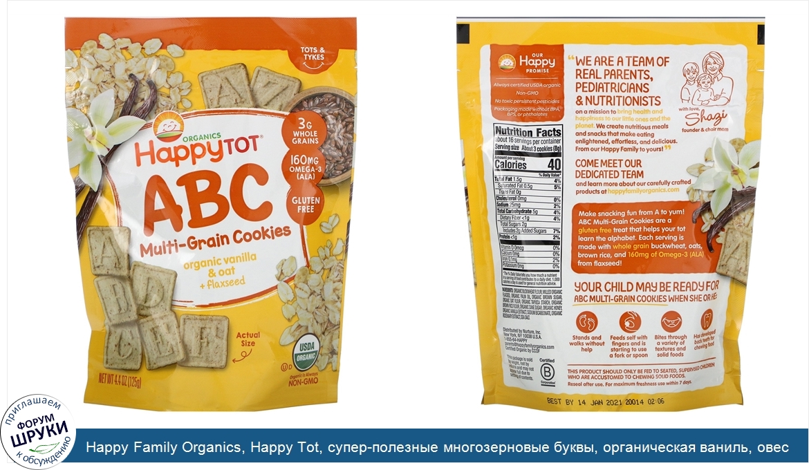Друзья, если у вас есть отзыв/дополнение/комментарий/вопрос относительно Happy Family Organics, Happy Tot, супер-полезные многозерновые буквы, органическая ваниль, овес, льняное семя, 4,4 унц. (125 г) - напишите его ответом в эту тему (это будет полезно всему сообществу в целом и вам в отдельности).
