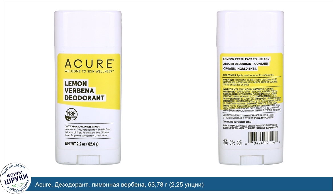 Acure, Дезодорант, лимонная вербена, 63,78 г (2,25 унции)