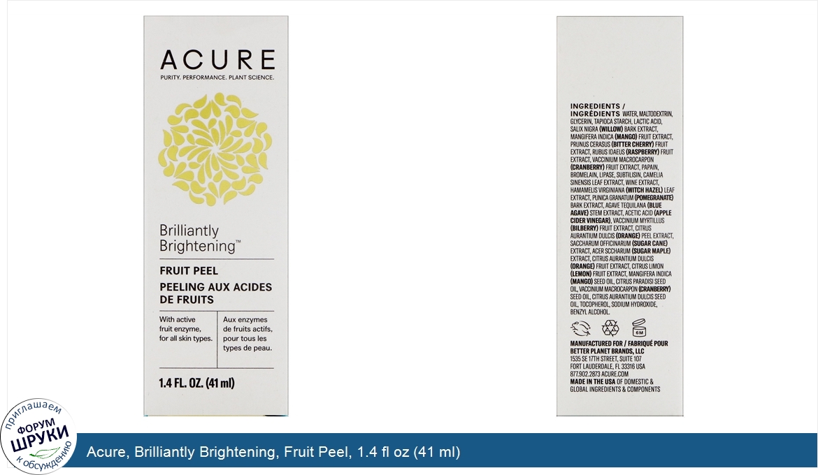 Друзья, если у вас есть отзыв/дополнение/комментарий/вопрос относительно Acure, Brilliantly Brightening, Fruit Peel, 1.4 fl oz (41 ml) - напишите его ответом в эту тему (это будет полезно всему сообществу в целом и вам в отдельности).