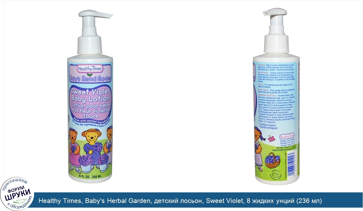 Друзья, если у вас есть отзыв/дополнение/комментарий/вопрос относительно Healthy Times, Baby's Herbal Garden, детский лосьон, Sweet Violet, 8 жидких унций (236 мл) - напишите его ответом в эту тему (это будет полезно всему сообществу в целом и вам в отдельности).