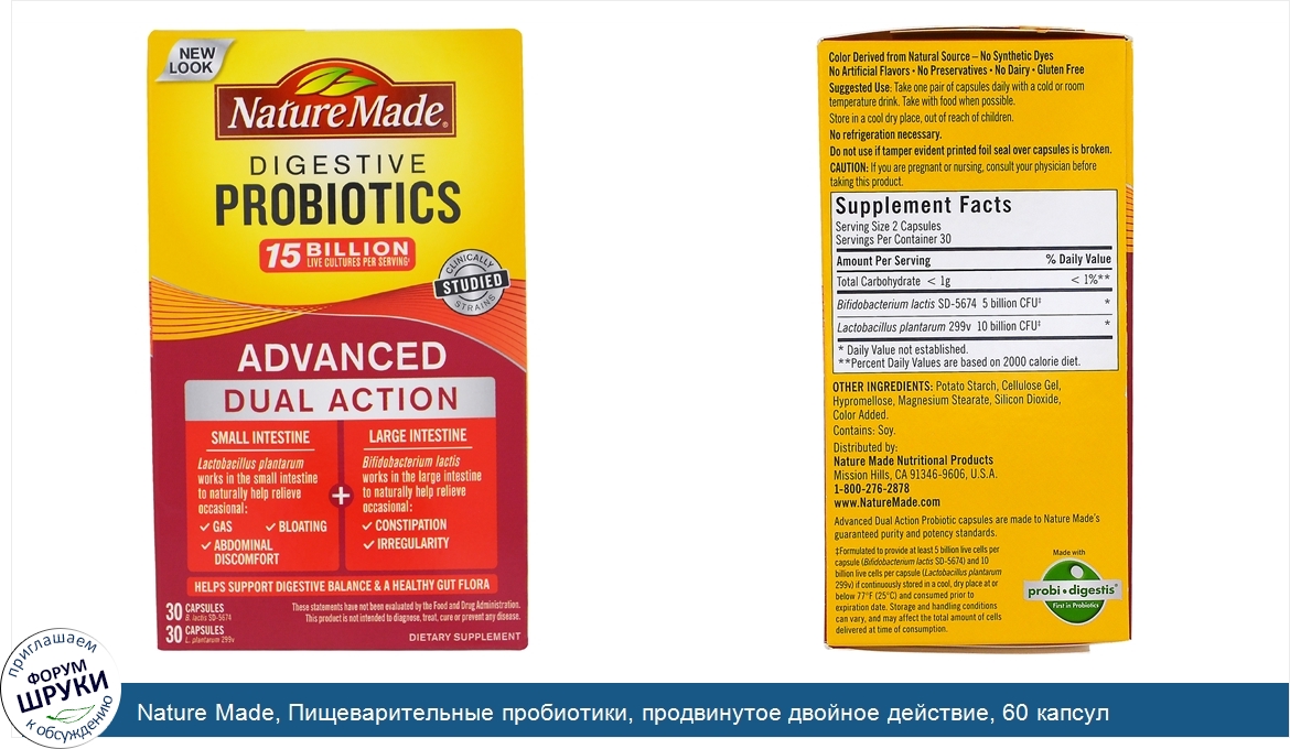 [DESCRIPT]15 миллиардов живых культур в порции‡. Клинически изученный штамм. Помогает поддерживать здоровые пищеварение и кишечную микрофлору. Пищевая добавка. Не содержит молочных продуктов. Не содержит глютена. 100% вегетарианский продукт. Комплект: . 30 капсул - B. lactis SD-5674. 30 капсул - Лактобактерии плантарум 299v. Тонкая кишка. Толстая кишка. Лактобактерии плантарум действует в тонком кишечнике для естественного избавления от эпизодических:. Bifidobacterium lactis действуют в толстой кишке для естественного облегчения от эпизодических:. газов. запоров. вздутия. расстройств. неприятных ощущения в животе. ‡Препарат содержит минимум 5 миллиардов живых клеток на капсулу (Bifidobactertium lactis SD-5674) и 10 миллиардов живых клеток на капсулу (Lactobacillus plantarum 299v), если он постоянно хранится в прохладном, сухом месте или ниже 77ºF (25ºC) и потребляется до истечения срока действия. Почему принимать Advanced Dual Action Probiotics? Зачем принимать пробиотик, который действует только в одной части пищеварительного тракта? Nature Made Advanced Dual Action Probiotic содержит два штамма пробиотиков, которые помогают поддерживать здоровую флору кишечника:. 10 миллиардов КОЕ L. plantarum 299v способствуют снижению эпизодических газов, вздутия живота и дискомфорта в тонкой кишке. 5 миллиардов КОЕ B. lactis SD-5674 способствуют облегчению от случайных запоров и расстройств в толстой кишке. Почему Nature Made Probiotics? Гарантированная активность до истечения срока годности. Клинически эффективная доза. Достаточно мягкое средство для повседневного приема. Бренд с 40-летней историей.[/DESCRIPT]... (описание дополняется)