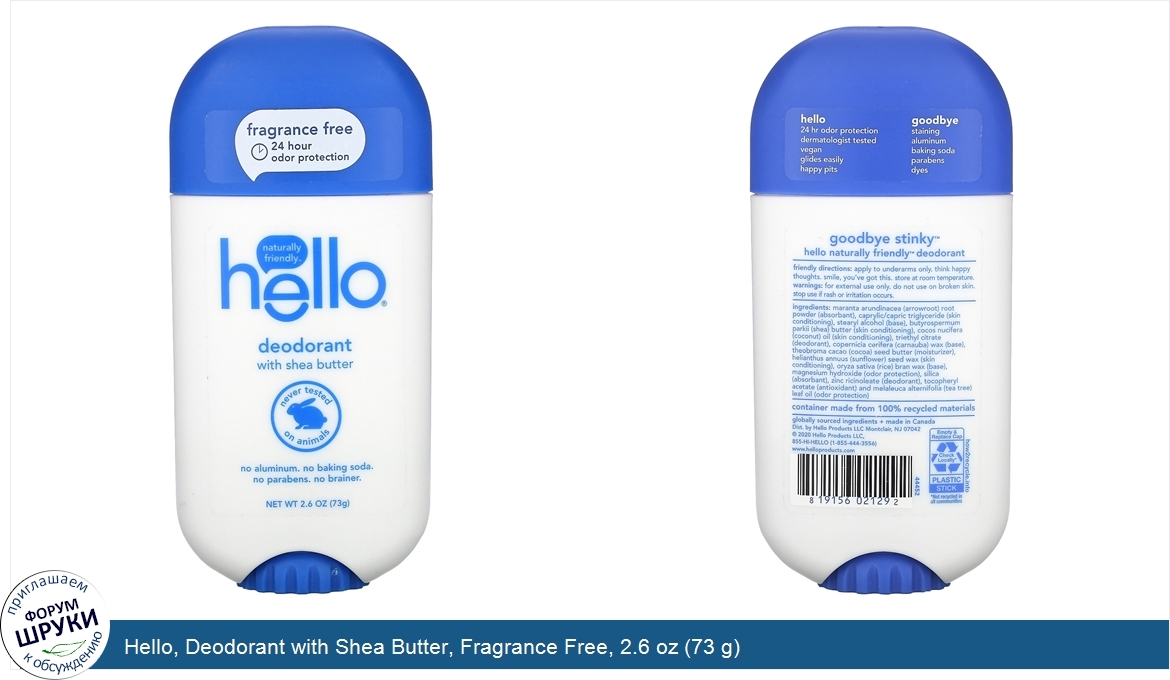 Друзья, если у вас есть отзыв/дополнение/комментарий/вопрос относительно Hello, Deodorant with Shea Butter, Fragrance Free, 2.6 oz (73 g) - напишите его ответом в эту тему (это будет полезно всему сообществу в целом и вам в отдельности).