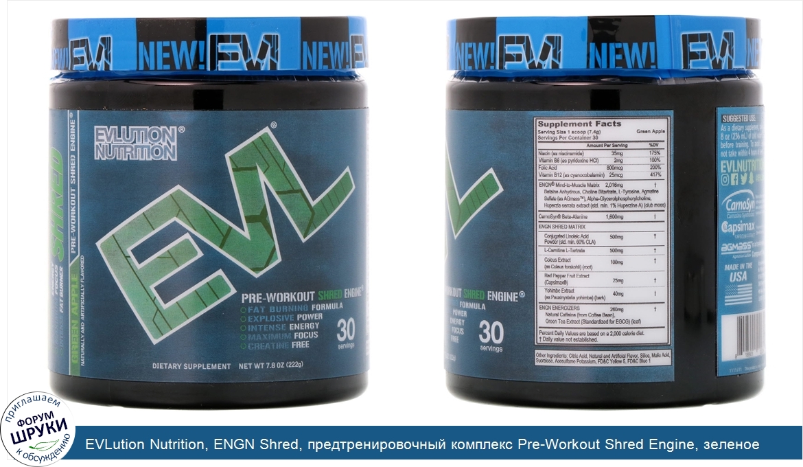 Друзья, если у вас есть отзыв/дополнение/комментарий/вопрос относительно EVLution Nutrition, ENGN Shred, предтренировочный комплекс Pre-Workout Shred Engine, зеленое яблоко, 222 г - напишите его ответом в эту тему (это будет полезно всему сообществу в целом и вам в отдельности).