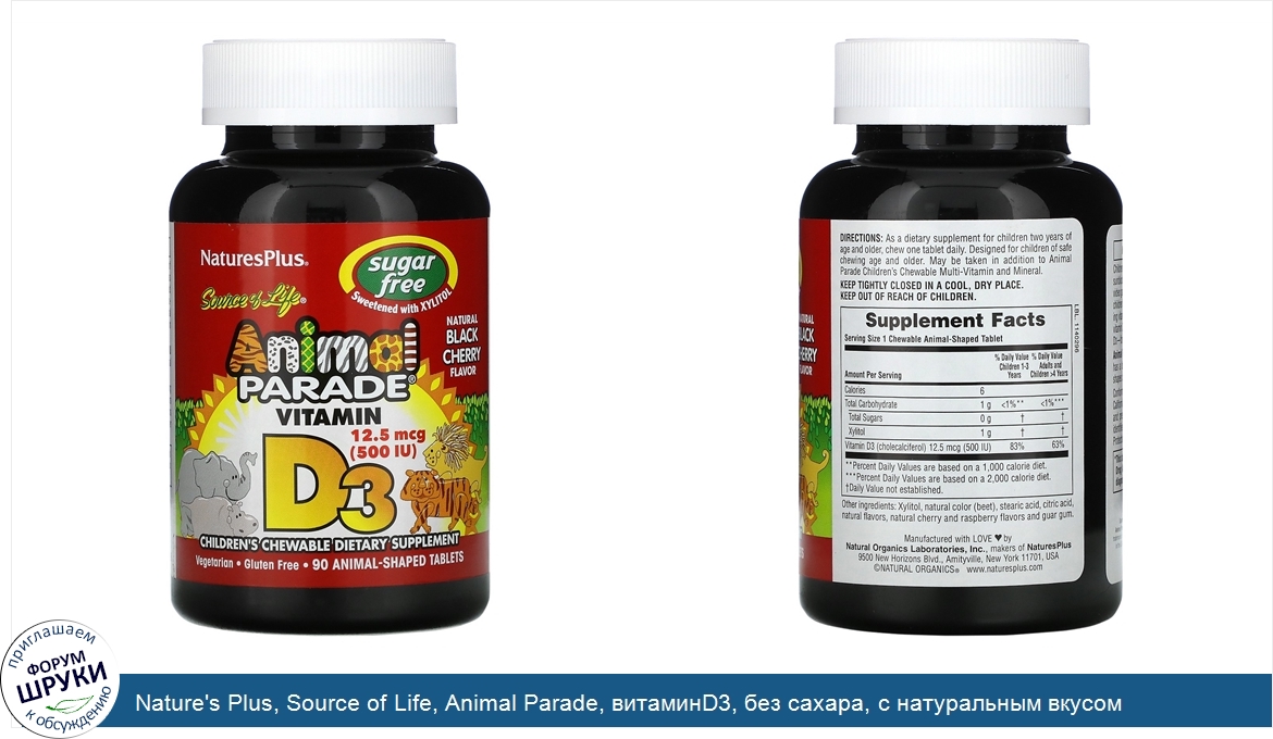 Nature's Plus, Source of Life, Animal Parade, витаминD3, без сахара, с натуральным вкусом черешни, 12,5мкг (500МЕ), 90таблеток в форме животных
