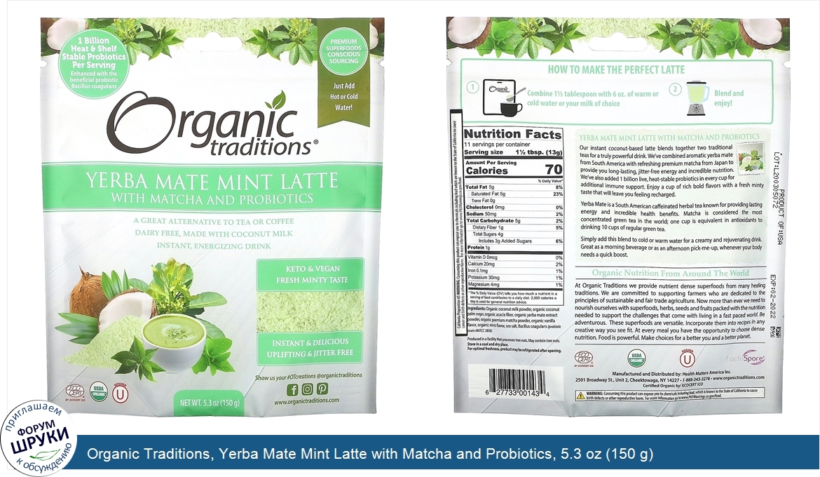 [DESCRIPT]1 Billion Heat Shelf Stable Probiotics Per Serving. Enhanced with The Beneficial Probiotic Bacillus Coagulans. Premium Superfoods Conscious Sourcing. Just Add Hot or Cold Water! A Great Alternative to Tea or Coffee. Dairy Free, Made with Coconut Milk. Instant, Energizing Drink. Keto Vegan. Fresh Minty Taste. Instant Delicious Uplifting Jitter Free. Ecocert. USDA Organic. Kosher. LactoSpore®. Certified Organic by: Ecocert ICO. Yerba Mate Mint Latte With Matcha And Probiotics. Our instant coconut-based latte blend together two traditional teas for a truly powerful drink. We've combined aromatic yerba mate from South America with refreshing premium matcha from Japan to provide you long-lasting, jitter-free energy and incredible nutrition. We've also added 1 billion live, heat-stable probiotics in every cup for addition immune support. Enjoy a cup of rich bold flavors with a fresh minty taste that will leave you feeling recharged. Yerba Mate is a South American caffeinated herbal tea known for providing lasting energy and incredible health benefits. Matcha is considered the most concentrated green tea in the world; one cup is equivalent in antioxidants to drinking 10 cups of regular green tea. Simply add this blend to cold or warm water for a creamy and rejuvenating drink. Great as a morning beverage or as an afternoon pick-me-up, whenever your body needs a quick boost. Organic Nutrition From Around The World. At Organic Traditions we provide nutrient dense superfoods from many healing traditions. We are committed to supporting farmers who are dedicated to the principles of sustainable and fair trade agriculture. Now more than ever we need to nourish ourselves with superfoods, herbs, seeds and fruit packed with the nutrition needed to support the challenges that come with living in a fast paced world. Be adventurous. These superfoods are versatile. Incorporate them into recipes in any creative way you see fit. At every meal you have the opportunity to choose dense nutrition. Food is powerful. Make choice for a better you and a better planet.[/DESCRIPT]... (описание дополняется)