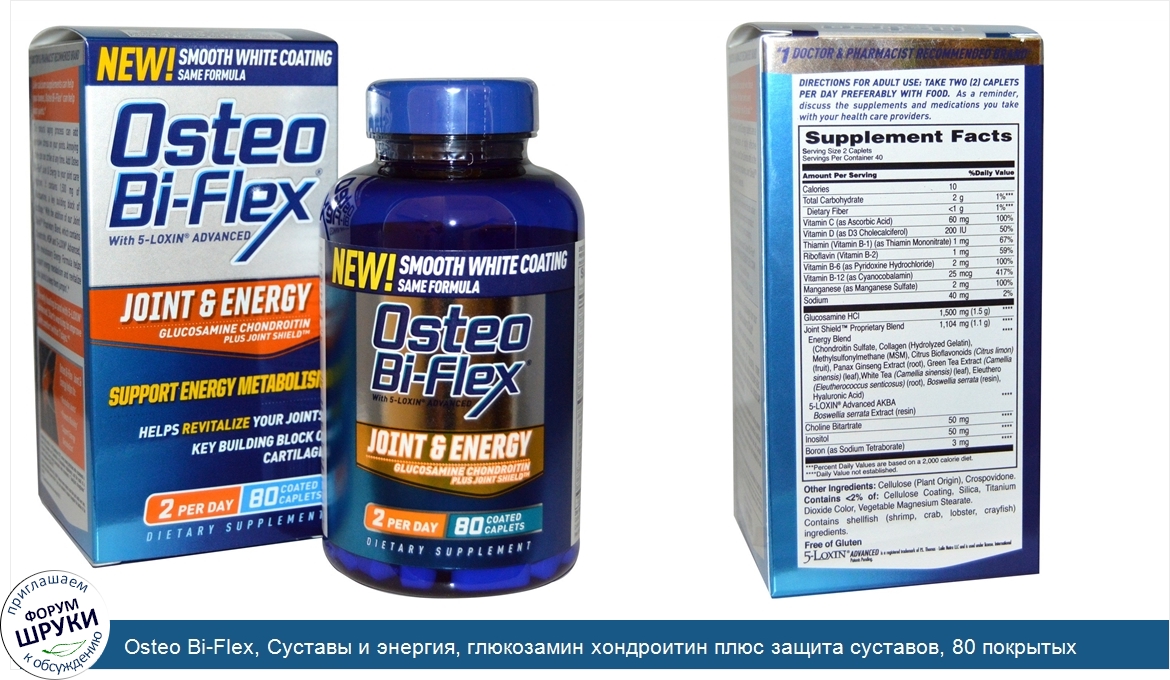 [DESCRIPT]Новинка! . Гладкая белая оболочка. Та же формула. Улучшенная добавлением формулы 5-Loxin. Поддерживает энергетический метаболизм. Помогает оживить ваши суставы. Ключевой строительный материал для хрящей. 2 таблетки в день. Пищевая добавка. Рекомендуемый врачами и фармацевтами бренд №1∇. Присоединяйтесь к миллионам людей, которые выбрали препарат Osteo Bi-Flex для суставов на каждый день и сделали его брендом №1.**. Таблетки в форме каплет Osteo Bi-Flex для суставов и энергии — это мощная комбинация высокоэффективных ингредиентов, известных науке заботы о суставах, и это единственный бренд, содержащий защитную формулу для суставов 5-Loxin. Препарат Osteo Bi-Flex производится в соответствии с самыми жесткими стандартами качества, чистоты и эффективности продукции. Аналогично тому, как кальциевые добавки помогают вашим костям, препарат Osteo Bi-Flex помогает вашим суставам. Естественный процесс старения может нанести дополнительный стресс вашим суставам. Раздражающие обострения могут возникнуть в любое время. Внесите в свой стандартный режим заботы о суставах препарат Osteo Bi-Flex для суставов и энергии. Он содержит 1500 мг глюкозамина, ключевого элемента для хрящей. Благодаря нашей запатентованной смеси для защиты суставов Joint Shield, которая содержит хондроитин, МСМ и 5-Loxin, эта революционная энергетическая формула поможет вам поддержать энергетический метаболизм и оживить суставы, поддерживая их в превосходной форме. Единственный бренд с формулой 5-Loxin. Эффект ощутим уже в течение первых 7 дней. Osteo Bi-Flex для суставов и энергии помогает:. Оживить ваши суставы. Улучшить подвижность. Поддержать энергетический метаболизм. ∇На основании результатов опроса GfK Healthcare за 2011 год, который проводился среди терапевтов, которые порекомендовали своим пациентам глюкозамин и хондроитин или добавки с содержанием глюкозамина; и на основании результатов опроса Pharmacy Times, который проводился среди фармацевтов, которые рекомендовали диетические добавки для «усиления костей/суставов» в 2006-2012 годах. 1. На основании двух исследований на людях, в которых испытуемые проводили оценку здоровья своих суставов с течением времени; в них было доказано, что прием 5-LOXIN Advanced улучшает состояние суставов уже в первые 7 дней приема. **данные исследования Nielsen ScanTrack за 52 недели, завершившегося 25.08.12.[/DESCRIPT]... (описание дополняется)