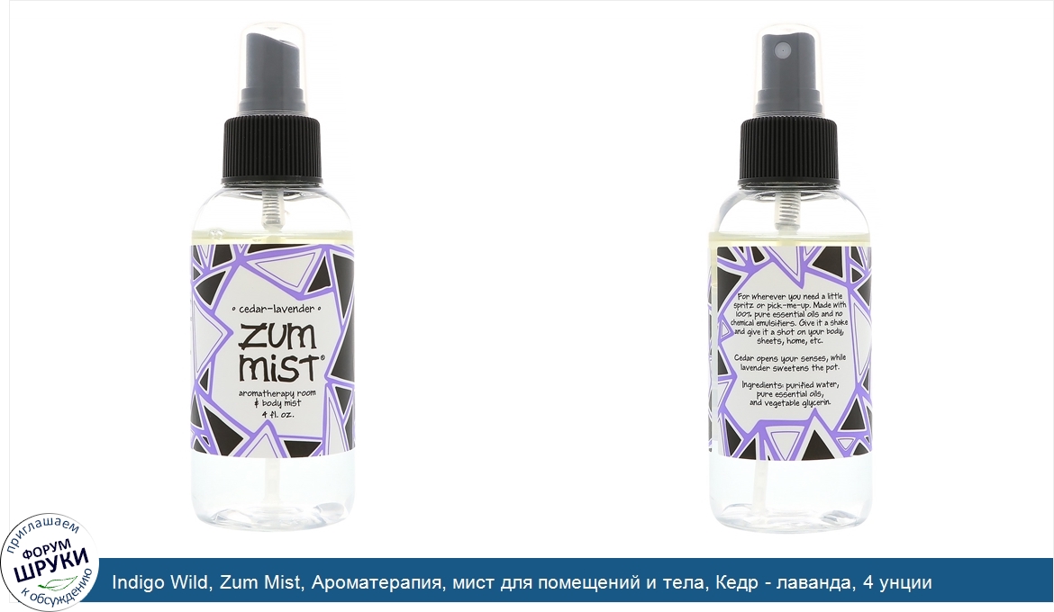 Друзья, если у вас есть отзыв/дополнение/комментарий/вопрос относительно Indigo Wild, Zum Mist, Ароматерапия, мист для помещений и тела, Кедр - лаванда, 4 унции - напишите его ответом в эту тему (это будет полезно всему сообществу в целом и вам в отдельности).