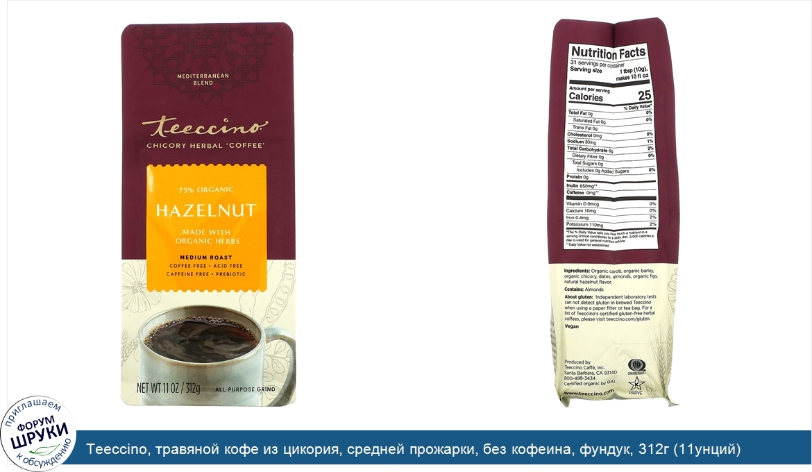 Друзья, если у вас есть отзыв/дополнение/комментарий/вопрос относительно Teeccino, травяной кофе из цикория, средней прожарки, без кофеина, фундук, 312г (11унций) - напишите его ответом в эту тему (это будет полезно всему сообществу в целом и вам в отдельности).