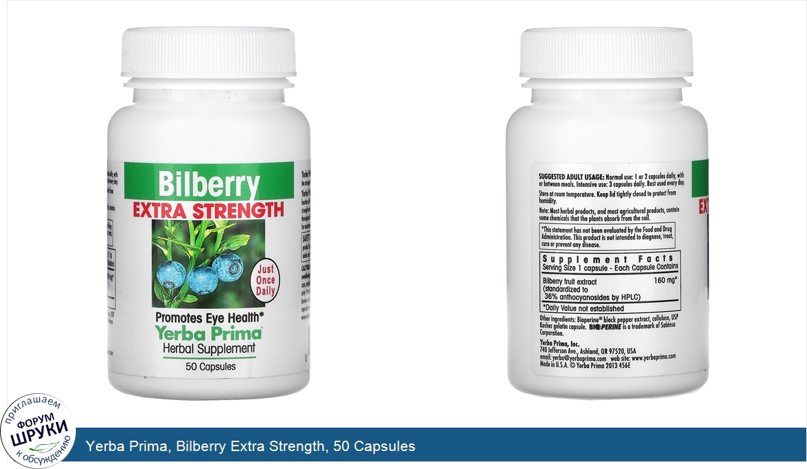 [DESCRIPT]Extra Strength. Just Once Daily. Promotes Eye Health. Yerba Prima. Herbal Supplement. Yerba Prima Bilberry Extra Strength for the strongest Bilberry benefits. Yerba Prima Bilberry supports proper function of the eyes and helps maintain strength and flexibility of capillaries throughout the body. *Contains Bioperine®. for maximum absorption.[/DESCRIPT]... (описание дополняется)