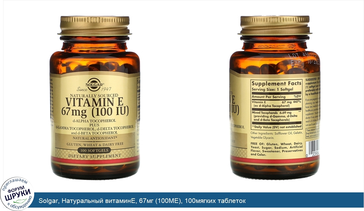 Друзья, если у вас есть отзыв/дополнение/комментарий/вопрос относительно Solgar, Натуральный витаминЕ, 67мг (100МЕ), 100мягких таблеток - напишите его ответом в эту тему (это будет полезно всему сообществу в целом и вам в отдельности).