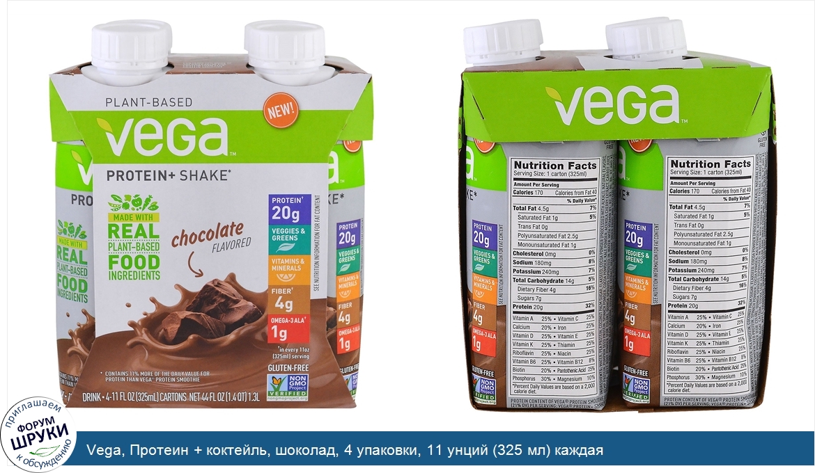 Vega, Протеин + коктейль, шоколад, 4 упаковки, 11 унций (325 мл) каждая