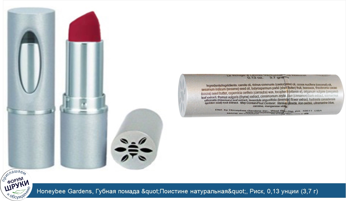 Друзья, если у вас есть отзыв/дополнение/комментарий/вопрос относительно Honeybee Gardens, Губная помада "Поистине натуральная", Риск, 0,13 унции (3,7 г) - напишите его ответом в эту тему (это будет полезно всему сообществу в целом и вам в отдельности).