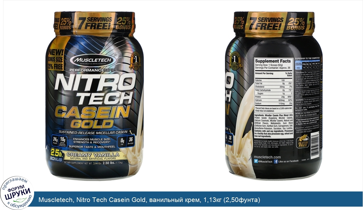 [DESCRIPT]25% дополнительно. 7 порций бесплатно! Бонусный размер: 25% бесплатно. Research Development. Performance Series. От самого популярного бренда добавок для бодибилдинга в Америке‡. Мицеллярный казеин замедленного высвобождения. 24 г протеина. 10 г аминокислот с разветвленной цепью, глютамин и прекурсор. Увеличение мышечного объема и силы, ускоренное восстановление. Отличные вкусовые ощущения. 0 г жира. 36 порций. 2,5 фунта дополнительно. Натуральные и искусственные ароматизаторы. Пищевая добавка. Без глютена. Бренд питания для физической активности № 1 — обладатель самого большого количества наград. № 1 по результатам научных исследований. Золотая награда American Masters of Taste в номинации Superior Taste. 20 лет передового опыта. Гарантированное отсутствие запрещенных ингредиентов. Произведено в соответствии со стандартами cGMP, применимыми ко всем пищевым добавкам. Если вы серьезно относитесь к продуктивности и результатам, попробуйте совершенно новые продукты All-New MuscleTech Performance Series! . Без собственных смесей. Без наполнителей. Без обмана (на этикетке указаны все ингредиенты). Без навязчивой рекламы. Без запрещенных веществ. Без исключений. Самая эффективная формула на рынке. Высококачественный казеиновый протеин замедленного высвобождения. На протяжении десятков лет MuscleTechе является лидером рынка по производству протеина. Опираясь на фундаментальные исследования человеческого организма, постоянно пребывая на переднем крае науки, он завоевал доверие бесчисленных потребителей по всему миру. Теперь та же команда научных сотрудников разработала новую формулу протеина с замедленным высвобождением, в состав которой входят превосходные источники белка с более продолжительным всасыванием и лучшим вкусом. Постоянное обеспечение аминокислотами замедленного высвобождения на протяжении 8 часов. Улучшите восстановление организма благодаря получению питательных веществ с замедленным высвобождением. Казеин и молочный протеин — это одни из самых медленно переваривающихся протеинов. Nitro-Tech Casein Gold содержит 24 г высококачественного протеина, полученного из многочисленных источников казеина премиум-класса, включающих преимущественно мицеллярный казеин. Фактически, согласно исследованию, опубликованному в «Американском журнале клинического питания» (The America Journal of Clinical Nutrition), источник белка, использованный в Nitro-Tech Casein Gold, имеет уникальную способность высвобождать аминокислоты в кровоток в течение 8 часов после приема¹ Благодаря замедленному высвобождению этот состав является высокоанаболическим и антикатаболическим, он обеспечивает благоприятную для роста мышечной массы среду в течение более продолжительного периода времени. Кроме того, каждая порция Nitro-Tech Casein Gold содержит 10 г натуральных аминокислот с разветвленной цепью, глутамин и прекурсор и всего лишь 1 г сахара. Учитывая, что вкусовые характеристики продукта отмечены наградами, Nitro-Tech Casein Gold подарит незабываемые ощущения не только вашим мышцам, но и вкусовым рецепторам! Протеиновый состав с отличным вкусом. Медленно переваривающийся протеиновый состав, который обеспечивает замедленное высвобождение аминокислот для непрерывного питания мышц. Смесь казеинового протеина высокого качества, которая позволяет поддерживать прекрасный аминокислотный профиль. 10 г анаболических аминокислот с разветвле