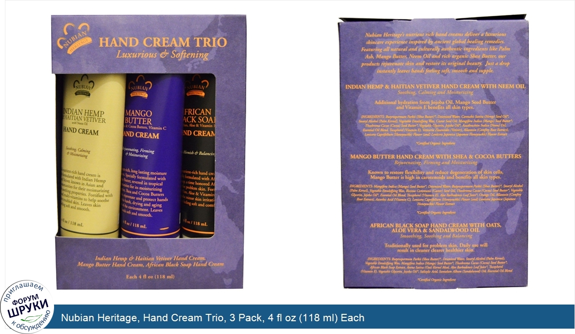 Друзья, если у вас есть отзыв/дополнение/комментарий/вопрос относительно Nubian Heritage, Hand Cream Trio, 3 Pack, 4 fl oz (118 ml) Each - напишите его ответом в эту тему (это будет полезно всему сообществу в целом и вам в отдельности).