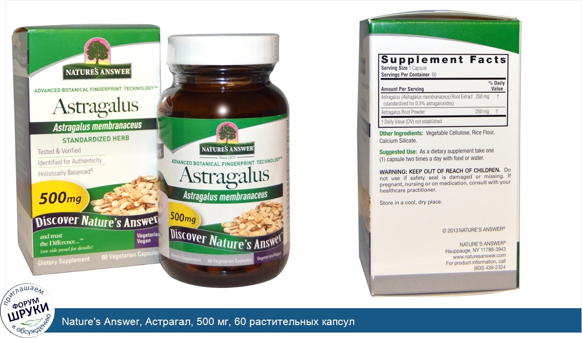 Друзья, если у вас есть отзыв/дополнение/комментарий/вопрос относительно Nature's Answer, Астрагал, 500 мг, 60 растительных капсул - напишите его ответом в эту тему (это будет полезно всему сообществу в целом и вам в отдельности).