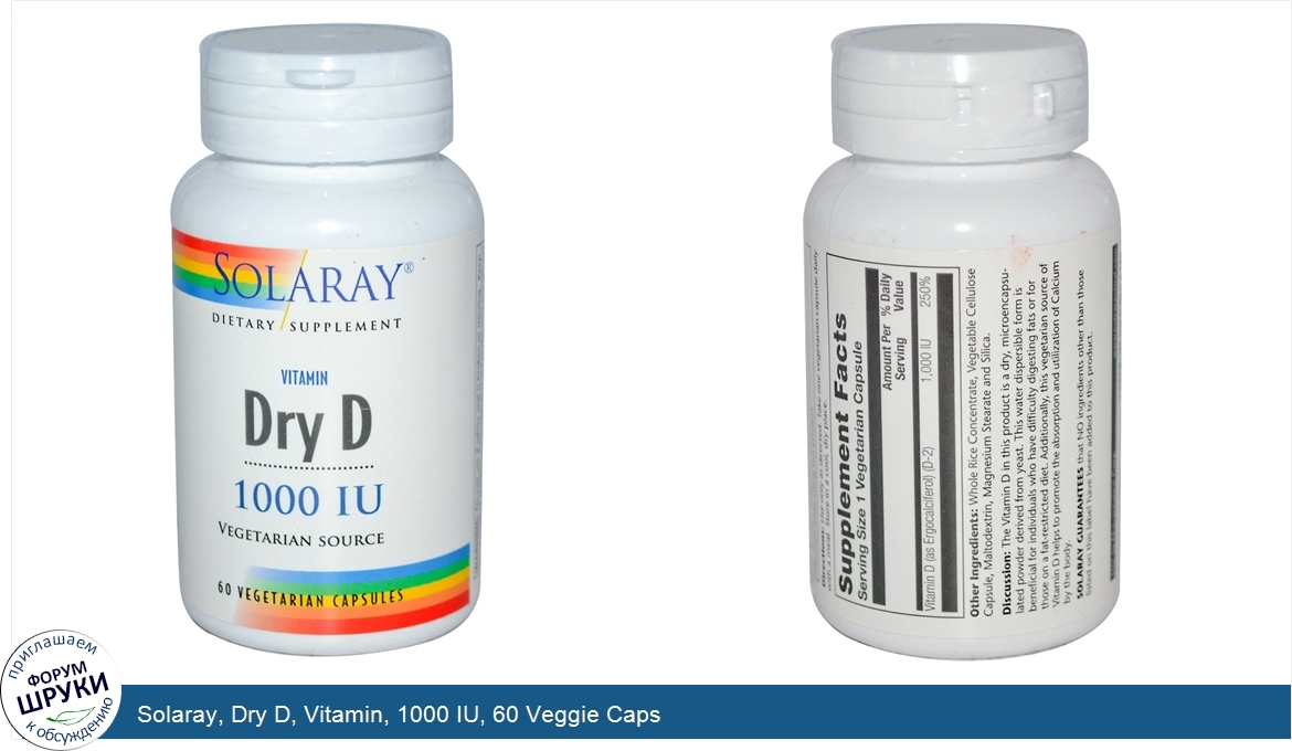 Друзья, если у вас есть отзыв/дополнение/комментарий/вопрос относительно Solaray, Dry D, Vitamin, 1000 IU, 60 Veggie Caps - напишите его ответом в эту тему (это будет полезно всему сообществу в целом и вам в отдельности).
