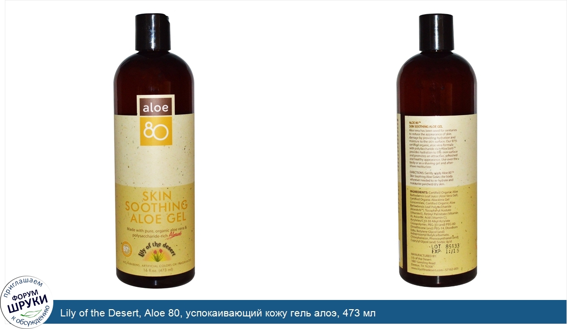 Друзья, если у вас есть отзыв/дополнение/комментарий/вопрос относительно Lily of the Desert, Aloe 80, успокаивающий кожу гель алоэ, 473 мл - напишите его ответом в эту тему (это будет полезно всему сообществу в целом и вам в отдельности).