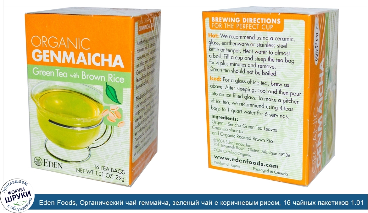 Друзья, если у вас есть отзыв/дополнение/комментарий/вопрос относительно Eden Foods, Органический чай геммайча, зеленый чай с коричневым рисом, 16 чайных пакетиков 1.01 унций (29 г) - напишите его ответом в эту тему (это будет полезно всему сообществу в целом и вам в отдельности).