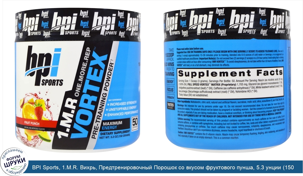 [DESCRIPT]Be Better. Be Stronger. BPI. Natural and Artificial Flavors. One.More.Rep. Maximum Energy. Dietary Supplement. 50 Servings. Energy. Focus. Strength. Tastes Awesome! . Performance. May Experience:. Increased Strength†. Unstoppable Energy†. Enhanced Performance†. The newest evolution of pre-workouts formulated to enhance and intensify the quality of your workouts. Benefits. Energy Stamina. - All of the energy, focus, and strength without the muscle building properties of creatine (great for stacking!). Mind/Muscle Connection. - 1.M.R Vortex provides enhanced mind/muscle connection and laser focus making each workout count. Strength Building. - Longer, better, and more energized workouts means increased endurance, strength, and overall productivity in the gym. Performance. - Unstoppable energy to help you push through every repetition and set at full force. † When combined with a proper exercise and nutrition regimen. Statements based on early-stage independent 3rd party in vivo and / or in vitro model scientific research data findings for individual ingredients.[/DESCRIPT]... (описание дополняется)