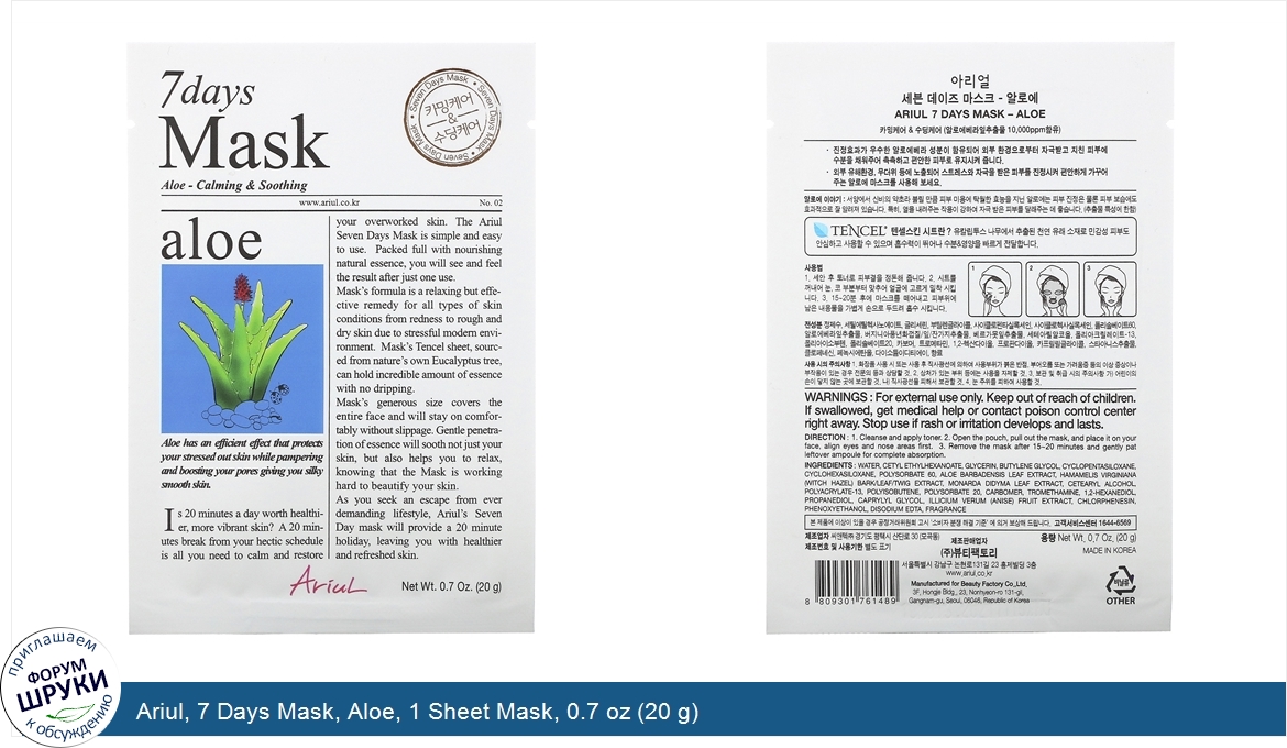 Друзья, если у вас есть отзыв/дополнение/комментарий/вопрос относительно Ariul, 7 Days Mask, Aloe, 1 Sheet Mask, 0.7 oz (20 g) - напишите его ответом в эту тему (это будет полезно всему сообществу в целом и вам в отдельности).