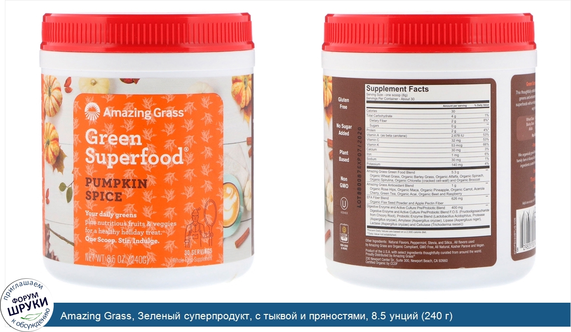 Друзья, если у вас есть отзыв/дополнение/комментарий/вопрос относительно Amazing Grass, Зеленый суперпродукт, с тыквой и пряностями, 8.5 унций (240 г) - напишите его ответом в эту тему (это будет полезно всему сообществу в целом и вам в отдельности).